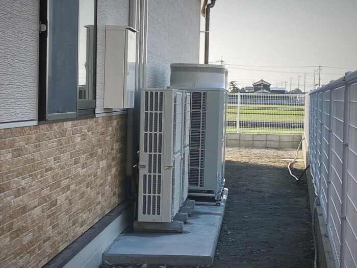 今回の工事では、幼稚園の各教室や共用スペースに対応する業務用エアコンの室外機を据え付けました。新築工事ならではの計画的な施工により、スムーズに作業を進めることができました。